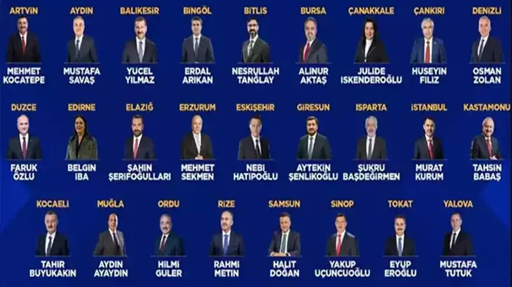 Artvin – Mehmet KocatepeAydın – Mustafa SavaşBalıkesir – Yücel YılmazBingöl – Erdal ArıkanBitlis – Nesrullah TanğlayBursa – Alinur AktaşÇanakkale – Jülide İskenderoğluÇankırı – Hüseyin FilizDenizli – Osman ZolanDüzce – Faruk ÖzlüEdirne – Belgin İbaElazığ – Şahin ŞerifoğullarıErzurum – Mehmet SekmenEskişehir – Nebi HatipoğluGiresun – Aytekin ŞenlikoğluIsparta – Şükrü Başdeğirmenİstanbul – Murat KurumKastamonu – Tahsin BabasKocaeli – Tahir BüyükakınMuğla – Aydın AyaydınOrdu – Mehmet Hilmi GülerRize – Rahmi MetinSamsun – Halit DoğanSinop – Yakup ÜçüncüoğluTokat – Eyüp EroğluYalova – Mustafa Tutuk