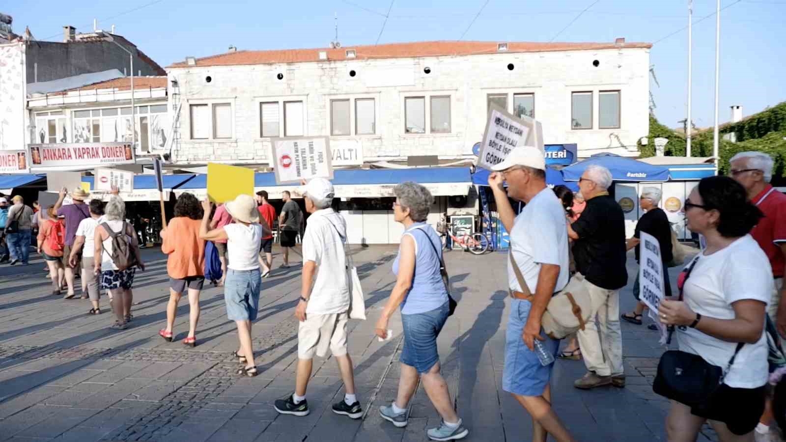 Geçen hafta İzmir Foça'da sahillerin özel işletmelere devredilmesini protesto eden Foça'nın Sesi Sosyal Yardımlaşma ve Dayanışma Platformu üyelerinden sonra bu hafta Foça Tarih ve Doğa Talanına Hayır Platformu, denizimize, kıyılarımıza sahip çıkıyoruz eylemi gerçekleştirdi.23 Ağustos akşam saat 18.00'da deniz kirliliği ve kıyı istilasına karşı Foça Belediyesi Sosyal Tesisleri önünde toplanan platform üyeleri ve eyleme katılan bazı vatandaşlar "Foça'ya sahip çık", "Sahil ve Kaldırımlar halkındır", "Foça babanın malı mı", "Kıyılar Halkındır" yazan dövizler ve sloganlar ile meydana doğru yürüdü. Platform adına basın açıklaması yapan Ramis Sağlam, "Foça'da bugün yaşanan kirliliğin diğer bir adı da deniz ve kıyı kirliliğidir. Foça merkezindeki deniz ve kıyı kirliliği her geçen yıl çıplak gözle daha da görünür hale gelmiştir. Bu kirlenmeyi görünür noktalarda file kepçe ile temizlemek mümkün değildir. Foça sahili boyunca yaşanan deniz kirliliğinin birçok nedeni olduğunu biliyoruz. Bunların başında denize yapılan atık su deşarjı, tekne aktiviteleri ve sintineler yer alıyor. Her yıl yaşadığımız bu yıl ise yoğun olarak yaşadığımız denizanası istilası iklim değişikliği ve yanlış yapılan balıkçılığın sonucudur" dedi."Belediye başkanının görevini yapmasını istiyoruz"Protestoculardan Şerife Aygün Gökçe" 1999 yılından beri Foça'dayım, İstanbul gibi büyük bir kentten sakin, emekliliğimi rahat geçireyim, organik zeytin üretimi yapalım dedik ancak çevre kirli. Sosyal demokrat bir partili belediye başkanı tarafından yönetilen Foça'da ona bile derdimizi anlatamıyoruz. Belediye başkanından sadece görevini yapmasını istiyoruz o bize genelde soruyor ne yapayım diye. Başkan koltuğuna oturmuş yönetici olmuş birisinin ne yapayım diye sorması kadar abes bir şey yok. Kendi çapımızda bizde dünya ölçeği bir grup içinde ortak ölçekli bir yöneticiyiz sen ne yapacağını bilmiyorsan o koltuğa niye oturuyorsun. Yaşanabilir bir kent yapıp vatandaşı temiz gıdaya, temiz doğaya, temiz denize mavi bayraklı diye iddia edilen denizanalarının bulunduğu denize temizlemeye, yani belediye başkanı olarak görevini yapacak ekstra bir şey istemiyoruz" ifadelerini kullandı."Protesto olacak diye meydana 2 gün önceden temizlediler"Marsilya meydanının yakın çevresinde ikamet eden Beyhan Filiz "53 senedir bu mahallede oturuyorum, Marsilya meydanında oturan bir birey olarak buralarının başıboş ve pislik içerisinde olmasından yana değilim. İnsanca yaşamaktan başka bir şey istediğimiz yok bizim. Yaşlanmışız, gürültü sonuna kadar, pislik sonuna kadar yetkililer bir an önce bu olaya el atsınlar bu olay çözülsün. Marsilya meydanına Marsilyalılar gelse kaçar. 2 gün önce burada protesto olacak diye temizlediler, 2 gün sonra gelin buraya giremezsin" şeklinde konuştu."Foça dört bir yandan kemiriliyor"Eyleme katılan Yunus Gökçe ise "Foça dört bir yandan kemiriliyor. Hem de gözümüze bakıla bakıla kemiriliyor. Tarım alanlarından denizine, kaldırımlarına varıncaya kadar insanı yok sayan yalnızca turizm adı altında hiçbir değer gözetmeden Foça'nın arkeolojik ve tarihi değerlerini hiçe sayan bir yaklaşımla Foça günden güne eriyor. Bu böyle devam ederse Foça'da atım atılacak yer kalmayacak, nefes alacak yer kalmayacak. Doğa bile bu duruma isyan ediyor, Foça 'ya sahip çıkmak için her alanda sahip çıkmak adına bu girişimi başlattık" dedi.