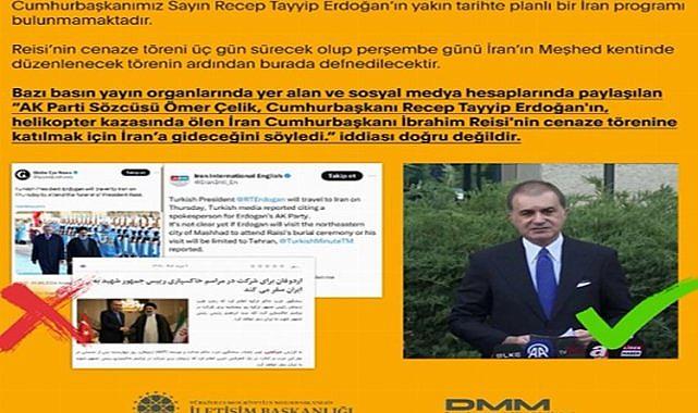Bazı basın yayın organlarında yer alan ve sosyal medya hesaplarında paylaşılan "AK Parti Sözcüsü Ömer Çelik, Cumhurbaşkanı Recep Tayyip Erdoğan'ın, helikopter kazasında ölen İran Cumhurbaşkanı İbrahim Reisi'nin cenaze törenine katılmak için İran'a gideceğini söyledi." iddiasının doğru olmadığı açıklandı.