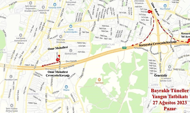 İzmir Valiliği, Bayraklı ilçesinde bulunan Bayraklı Tünelleri'nde 27 Ağustos Pazar günü saat 07.00 ile 09.00 arasında yapılacak yangın tatbikatı nedeniyle bazı yolların trafiğe kapatılacağını duyurdu.İzmir Valiliği, Bayraklı ilçesinde bulunan Bayraklı Tünelleri içerisinde yangın tatbikatı yapılacağını bildirdi. Valilikten yapılan açıklamada, "İlimiz Bayraklı ilçesinde bulunan Bayraklı Tünelleri içerisinde 27 Ağustos 2023 Pazar günü 07.00 ile 09.00 saatleri arasında yangın tatbikatı yapılacaktır. Belirtilen zaman dilimi süresince Çiğli'den Karşıyaka istikametine, Karşıyaka Çevreyolu çıkışından itibaren güzergah araç trafiğine kapatılacak ve trafik akışı Girne Bulvarı istikametine verilecektir. Girne Bulvarı'ndan Bayraklı Çevreyolu istikametine dönüşte ise Onur Mahallesi'nden Bornova Çevreyolu istikametine dönüş araç trafiğine kapatılacak ve bu güzergahlar üzerinde araç park etmeye müsaade edilmeyecektir" denildi.Açıklamada, "Ayrıca Bornova-Bayraklı yol ayrımı Karşıyaka istikameti de araç trafiğine kapatılacak, trafik; Çevreyolu Bornova-Bayraklı çıkışından Yüzbaşı İbrahim Hakkı Caddesi'ne verilecektir. Atatürk Mahallesi'nden Karşıyaka Çevreyolu istikametine dönüşte de Cengizhan Mahallesi'nden Karşıyaka istikametine Çevreyolu bağlantı kolu ve Westpark AVM katılım kolu, Karşıyaka istikametine araç trafiğine kapatılacaktır" ifadelerine yer verildi.